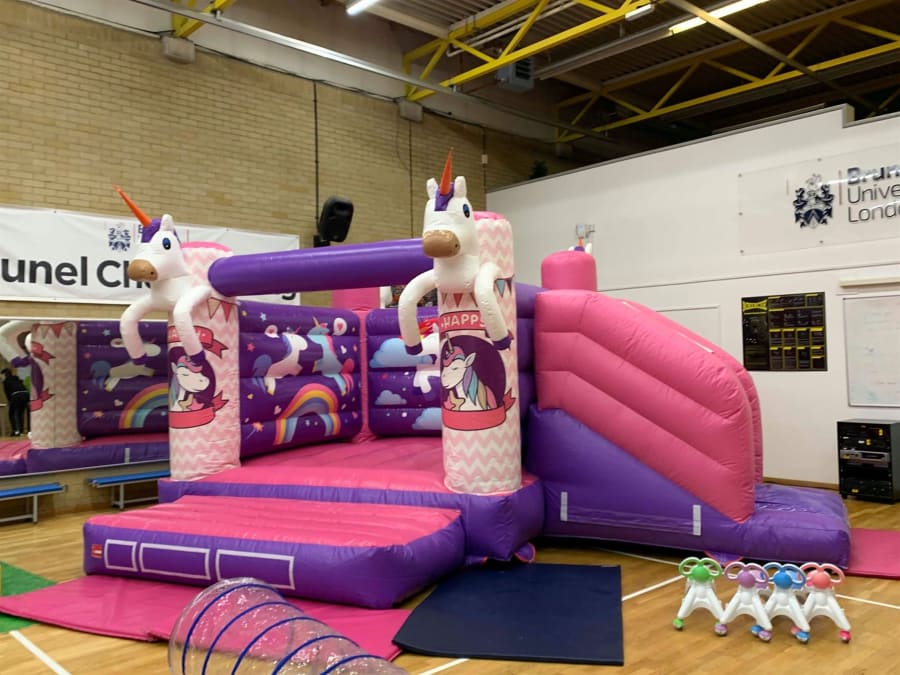 This beautiful bouncy castle is the perfect addition to any unicorn-themed celebration. Featuring a pretty pink bed adorned with giant unicorn heads, it will transport your little guests to a magical realm of fun and fantasy. 🏰✨