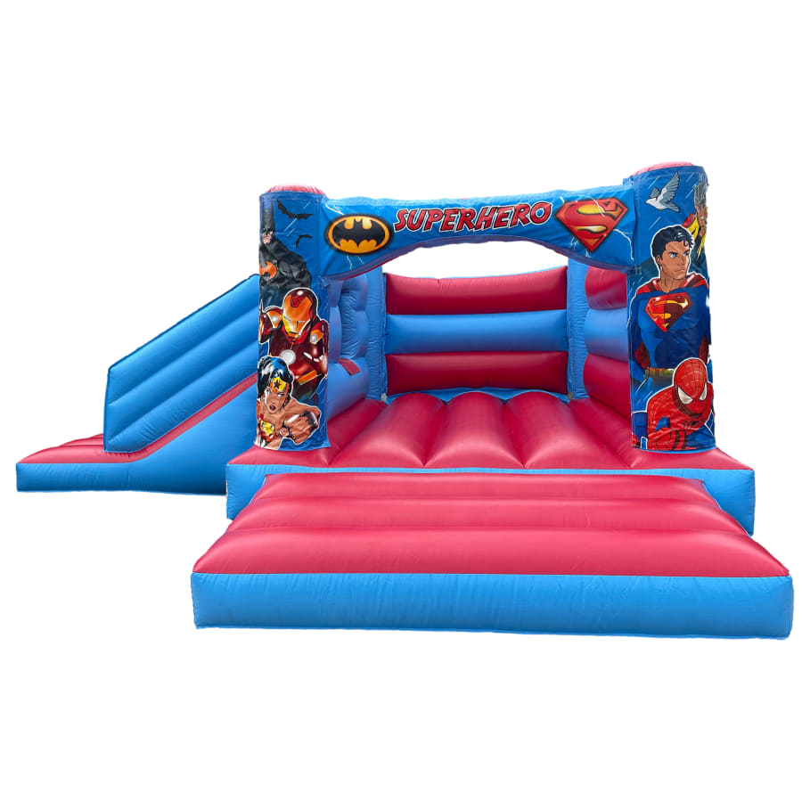 Exciting low-height superhero bouncy castle with slide, featuring Spider-Man, Iron Man, and many more iconic characters!